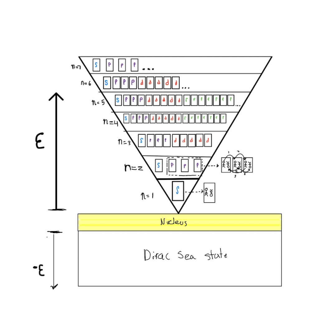 However this model is very comprehensive as it can even go beyond this general understanding and deeper into the relatively unknown quantum universe, like the nature of positrons and the dirac-sea state2 that exemplify the negative energy shells electrons can occupy which is below the building in the basement. To explain further